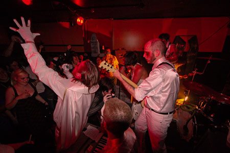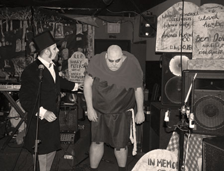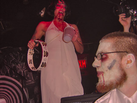 Friday Oct. 20th 2006 A Fancy success or drunken mess...? Fancy Magazine and Go Ape! Records wish to send a monsterous thanks to everyone who came out to the Fancy Haunting & helped make the evening a groin-grabbingly tremendous success. We are eternally grateful to Ghoul A Go-Go's Vlad Tsepis and Creighton for their magical mastery of the ceremony. When was the last time you saw a hunchback wield a live chainsaw in the midst of a densely crowded room of drunkards? Hunchback kicked off a mind-blowing set with special guest vocalist Creighton crooning on Nobody But Me. Amazing! The Brimstones kicked equal ass with a wicked set of their special brew of garage rock and R & B. A great big thanks to the main event, Direct From Hollywood Cemetery. They captivated the congregation and led the sheep to slaughter with a bad-ass batch of blistering tunes. This incredible set was in celebration of the release of their debut 7" EP on Brooklyn's favorite DIY label, Go Ape! Records. Click the lovely Lucretia to get your copy now!